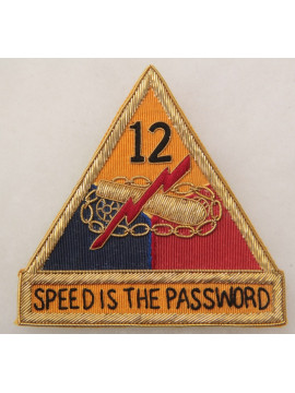 12th ARMORED DIVISION "bullion made". Superbe insigne tissu brodé en fil de cannetille dorée pour tenue de sortie. Fabrication allemande de 1945-50. TBE